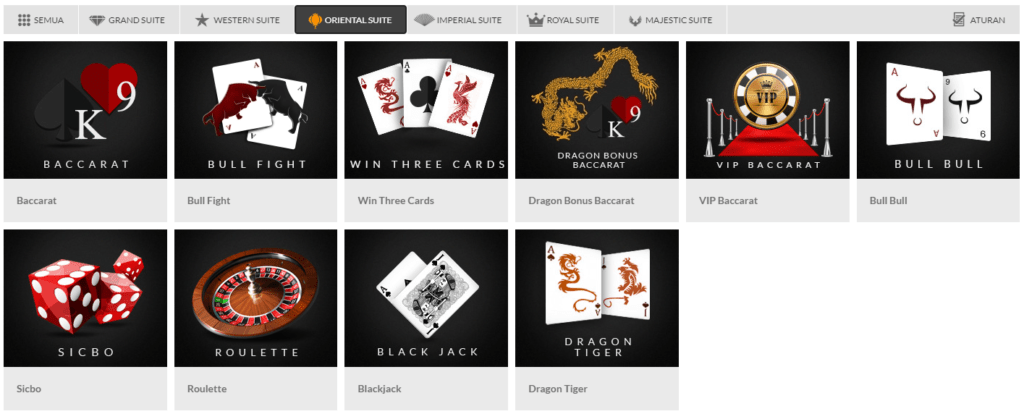Oriental Suite ini memiliki permainan Baccarat, Bull Fight, Win Three Cards, Dragon Bonus Baccarat, VIP Baccarat, Bull Bull, Sicbo, Roullete Blackjack dan Dragon Tiger.