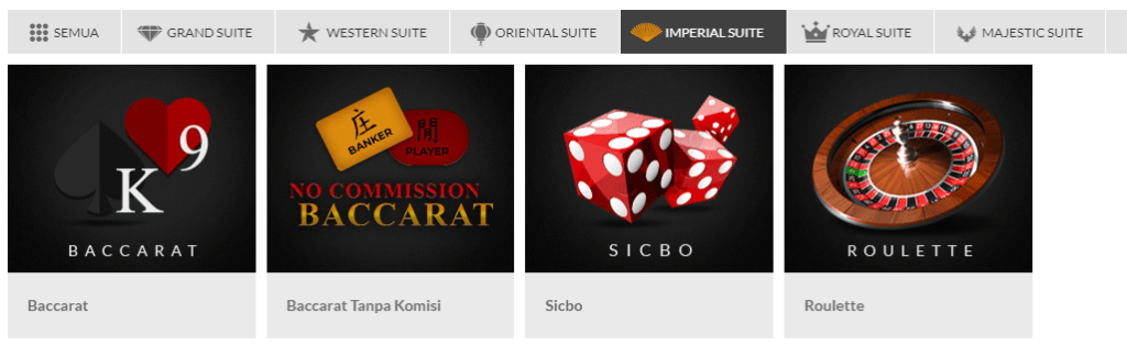 Grand suite juga merupakan dealer live casino terbaik di Indonesia dan sangat di rekomendasikan untuk setiap orang yang ingin mencoba peruntungan dengan memasang di salah satu permainan yang ada, seperti Baccarat, Parlay, Dragon Bonus Baccarat, Baccarat Banyak Meja, Bull Bull, Sicbo, Roullete dan Dragon Tiger.