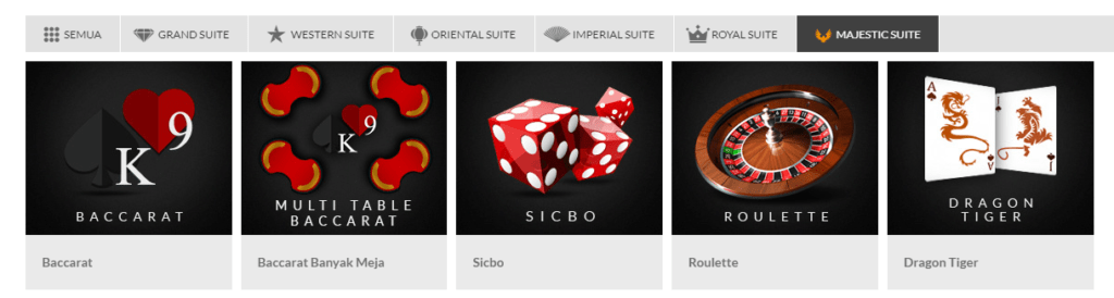 Majestic Suite Live Dealer menawarkan 5 permainan taruhan casino dengan permainan unggulannya yaitu Multi Table Baccarat yang mana member bisa memasang taruhan di beberapa meja baccarat sekaligus.